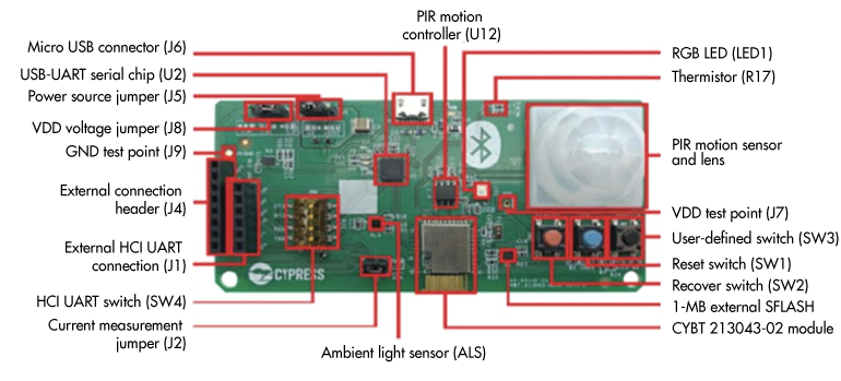 圖4顯示了可用于產(chǎn)品原型設(shè)計(jì)和開發(fā)的評(píng)估板示例。請(qǐng)注意,其中包括了智能照明應(yīng)用中通常需要的三個(gè)功能:用于照明設(shè)備的LED,開關(guān)以及用于占用傳感器的PIR運(yùn)動(dòng)檢測器。電路板底部邊緣中心的模塊包含BLE Mesh網(wǎng)絡(luò)以及運(yùn)行應(yīng)用程序軟件所需的CPU,內(nèi)存和天線。