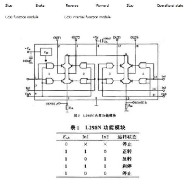 In3,In4的邏輯圖與表1相同。從表1可以看出,當(dāng)EnA 為低電平時(shí),輸入電平作用于電動(dòng)機(jī)控制。當(dāng)EnA 為高電平時(shí),輸入電平為高電平和低電平,并且電動(dòng)機(jī)為正或負(fù)。相同的低級(jí)電動(dòng)機(jī)停止,相同的電動(dòng)機(jī)制動(dòng)。L298?控制器的原理如下?: