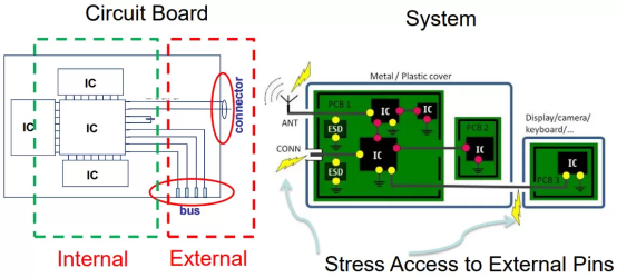 該圖顯示了可能發(fā)生系統(tǒng)級(jí)ESD的位置。暴露的IO和連接器是ESD事件可以將電脈沖傳播到系統(tǒng)中并可能損壞組件的明顯位置。